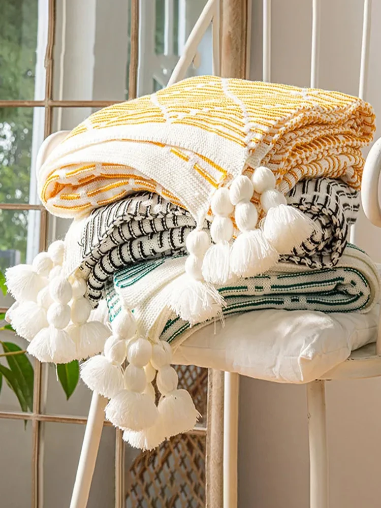 Style: tassel knitted blanketMaterial: AcrylicFeatures: soft plush, comfortable and skin-friendly, anti-allergicPattern: solid color, geometric, 3D rhombusColor: brown, light gray, dark pink, light pink, cream, dark gray, yellow, blue, navy.Use occasions: living room decoration, bedroom, outdoor, dining room, sofa, chair cushion, bed, sofa, etc.Package includes: 1 piece of tassel knitted blanket.Note: Please allows 3-5 error due to manual measurement.Thanks for your understanding.